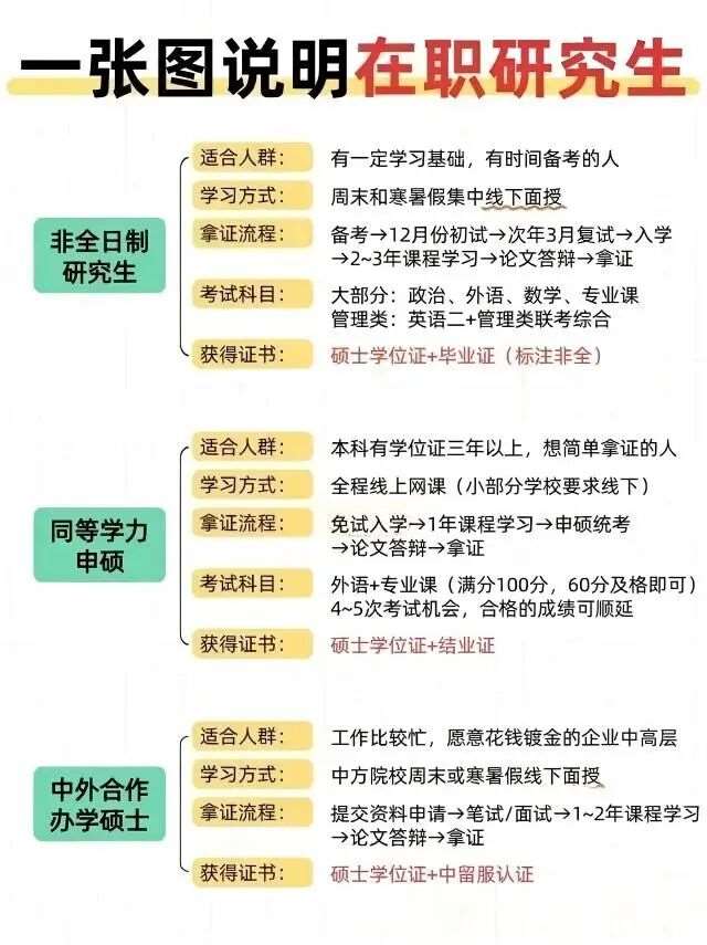 还在纠结在职研怎么选? 非全日制”“同等学力”“中外合作办学” 到底有啥区别?一张图理清核心,高效上岸~