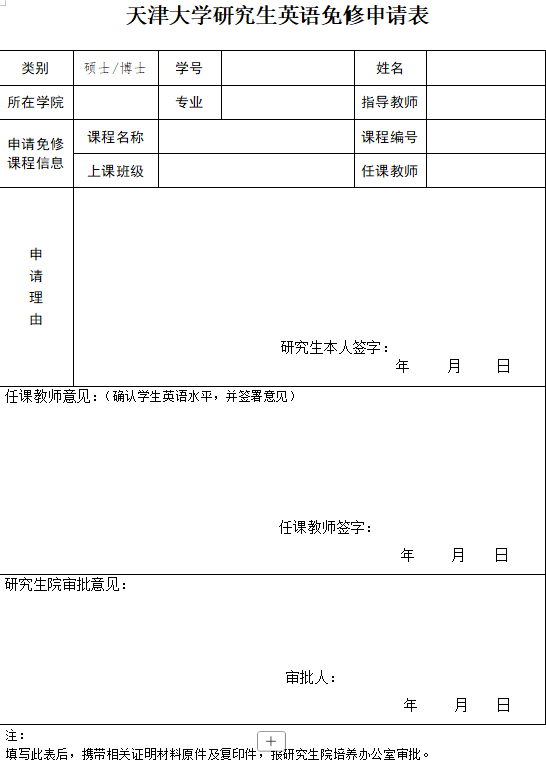 ⏩天津大学关于硕士研究生申请免修《研究生英语免修申请表》
