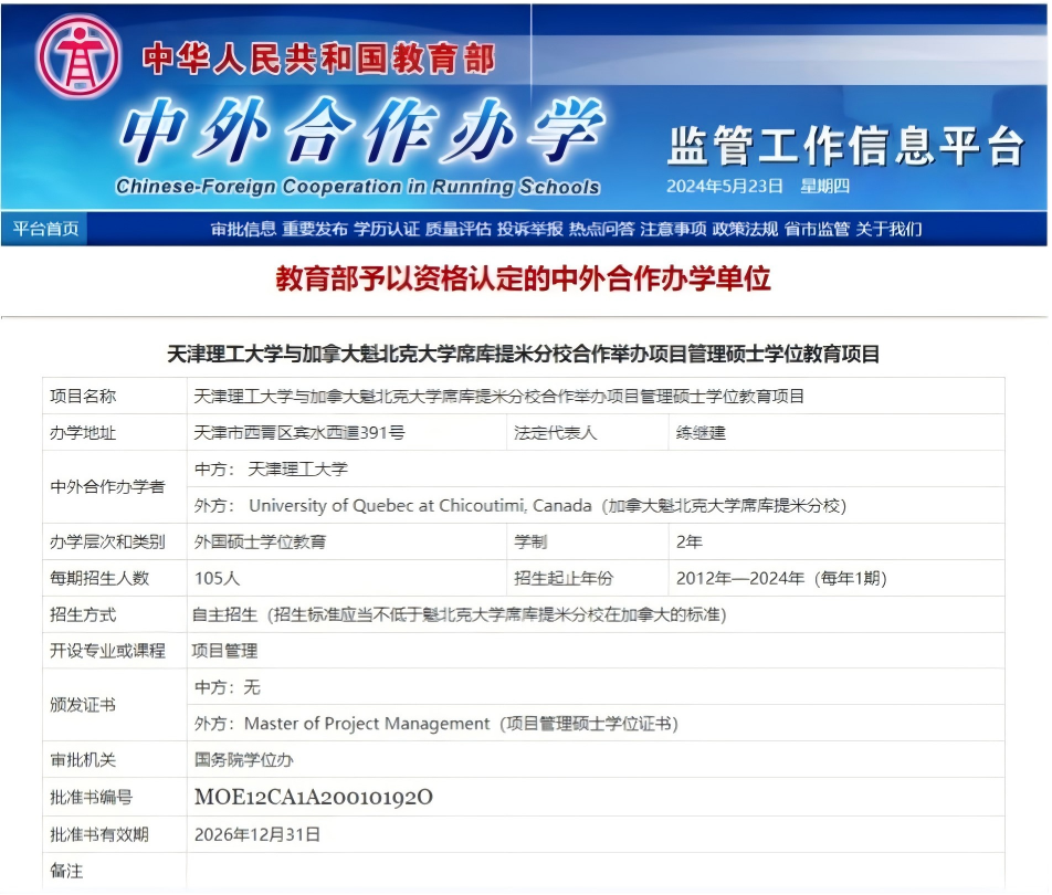 为了解决国内综合型的项目管理人才严重短缺的问题,满足国内对高级项目管理人才的需要, 2001年在当时国内尚无项目管理硕士点和博士点的情况下,学位委员会特别批准天津理工大学和加拿大魁北克大学合作举办“项目管理”硕士学位项目(批准的该类合作办学项目)。为国内培养高级项目管理人才,合格毕业生由加拿大魁北克大学授予“项 目管理硕士(MPM, Master of Project Management)”学位。国家承认。