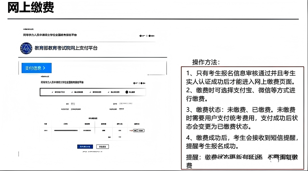 答:需等待信息审核,信息审核和人脸认证通过后方可缴费,未缴费一律视为报名无效!
