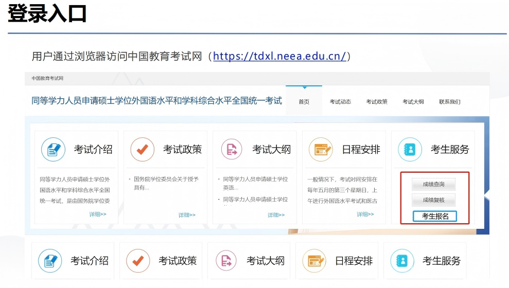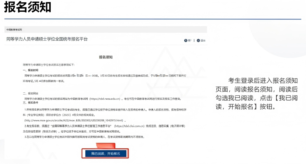 符合报考资格的考生须于3月16日至26日16:00前在中国教育考试网(https://tdxl.neea.edu.cn/,服务电话:010-82520230,接听时间:工作日9:00~17:00)报名,填报同等学力全国统考的语种、及考试地点,并实时关注审核结果。考生可选择报考学位授予单位、工作单位所在省(自治区、直辖市)参加考试。