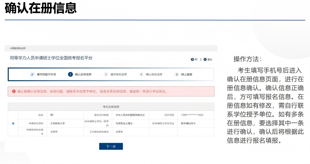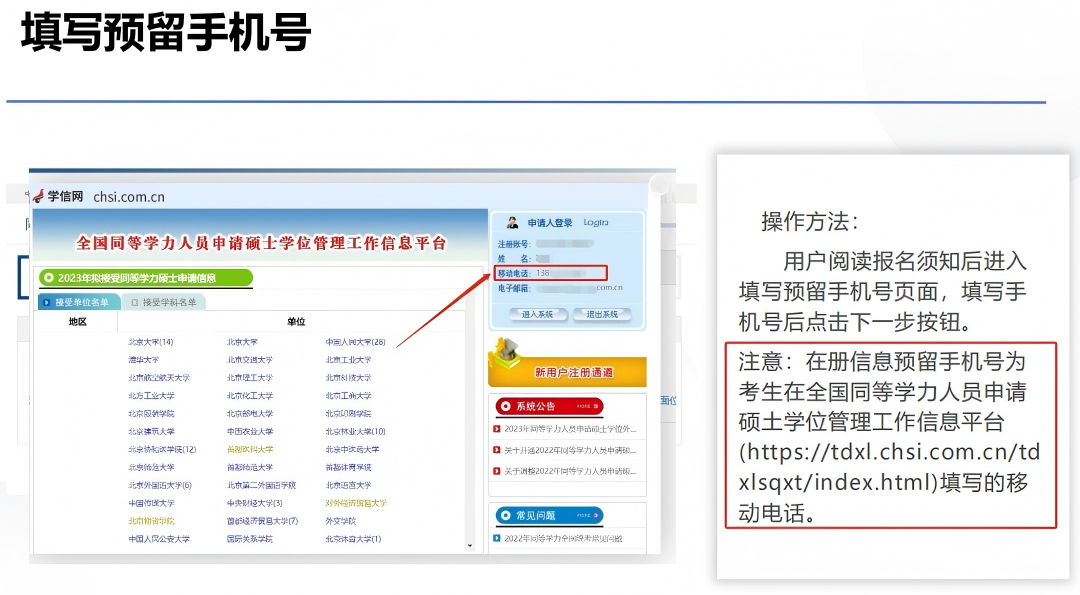 答:在册信息预留手机号码必须与考生在“全国同等学力人员申请硕士学位管理工作信息平台”上填写的号码一致!