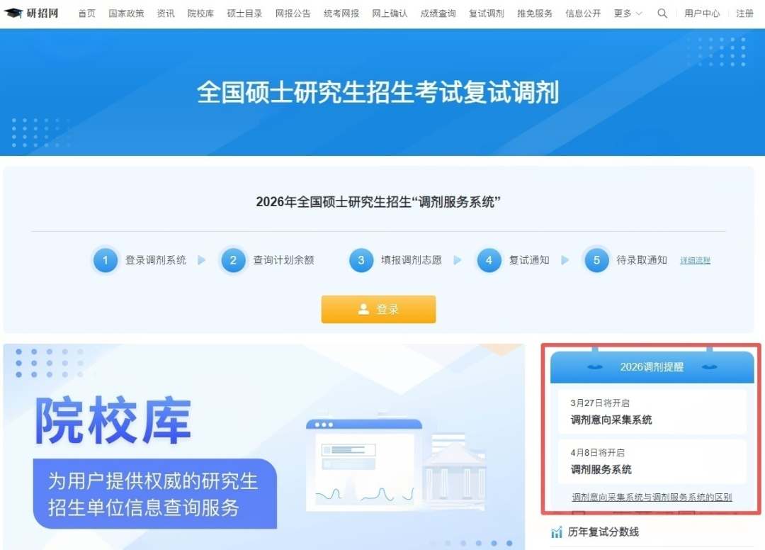 研招网【网上调剂】页面内容已经更新!2026年全国硕士研究生招生“网上调剂意向采集系统”将于3月27日开通,“调剂服务系统”将于4月8日开通。