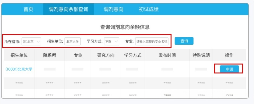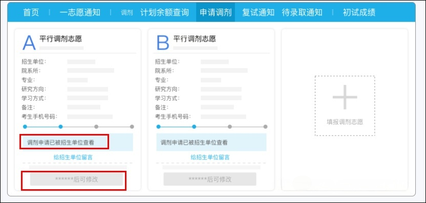 大家选择相应的招生单位、院系所、专业、学习方式以及研究方向后,点击“申请”按钮进入申请调剂页面,参加调剂的考生可一次填报三个平行调剂志愿。提交后的调剂志愿在招生单位设置的时间内不允许修改。这个时间一般不超过36小时。