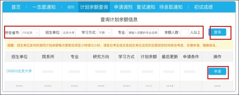 大家一定要认真阅读各招生单位在其院校信息栏目里及其它途径公布的调剂办法,打开研招网调剂专题后,用学信网账号登录全国硕士研究生招生调剂服务系统,通过“精确查询”或“模糊查询”的方式查询各招生单位的计划余额信息,特别要留意招生单位的调剂要求。